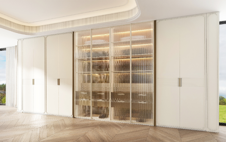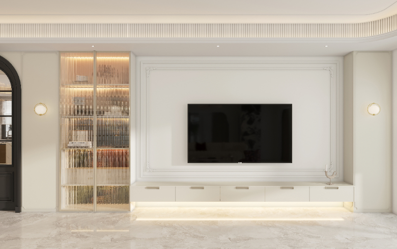 想空間不壓抑,左右對(duì)稱的餐酒柜柜門裝上長(zhǎng)虹玻璃,忽隱忽現(xiàn)的美感更誘人。
