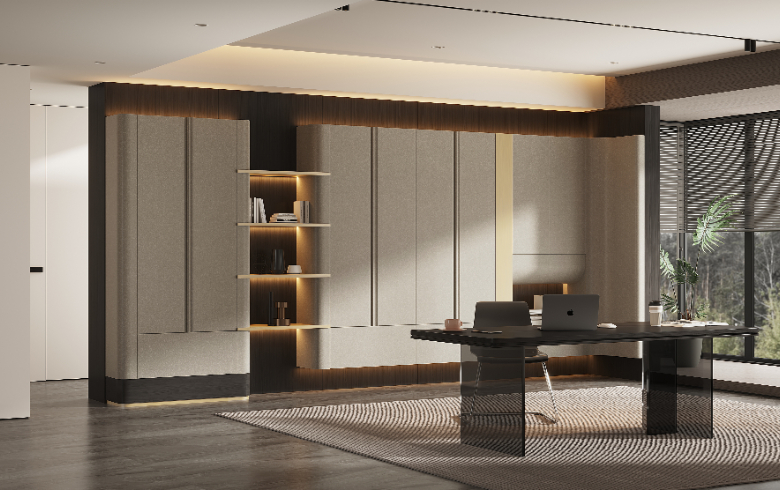 一側(cè)設(shè)計(jì)成懸浮書柜,輕盈時(shí)尚,打破整墻書柜的厚重壓抑感,讓學(xué)習(xí)工作更輕松有趣。