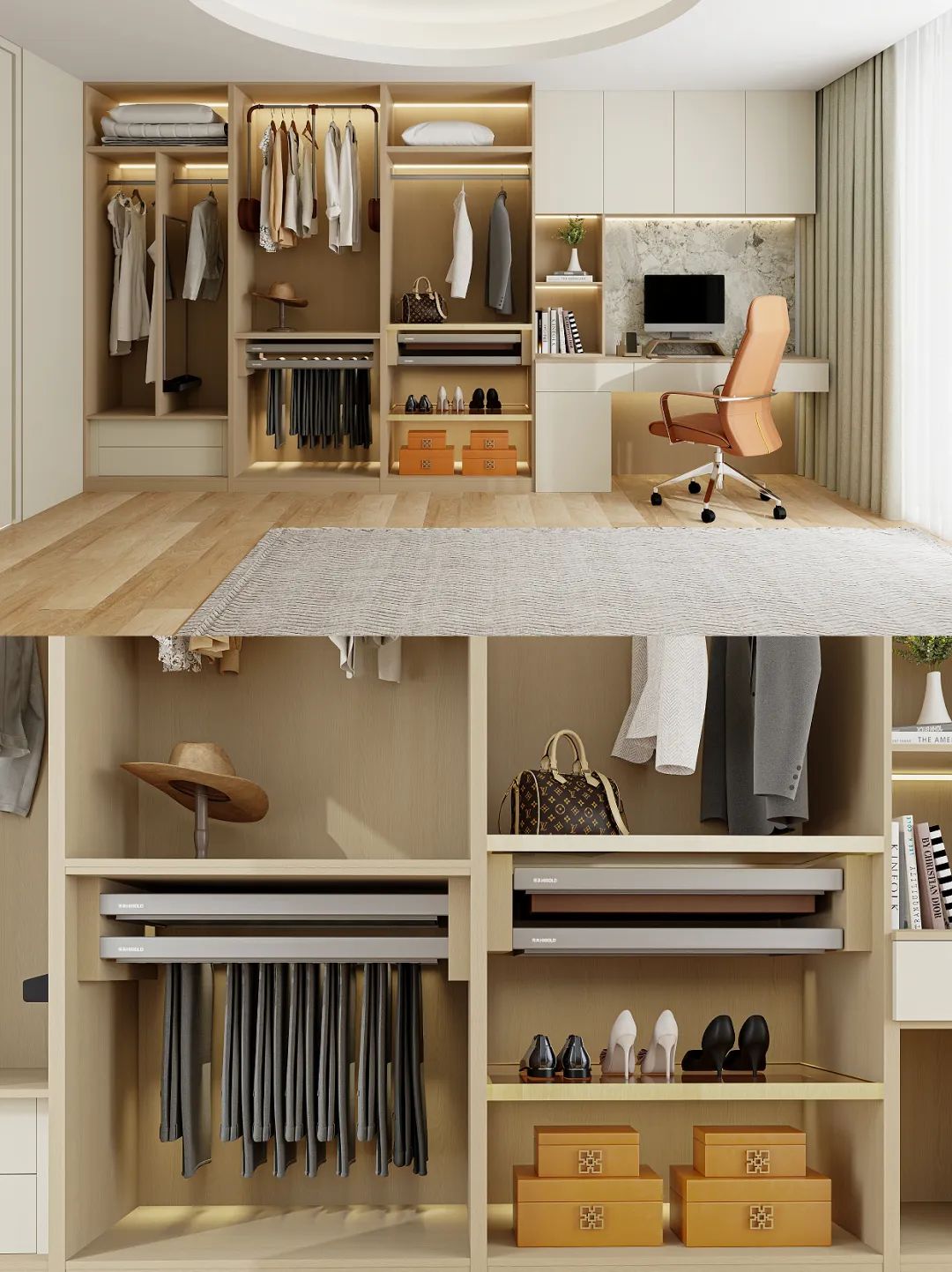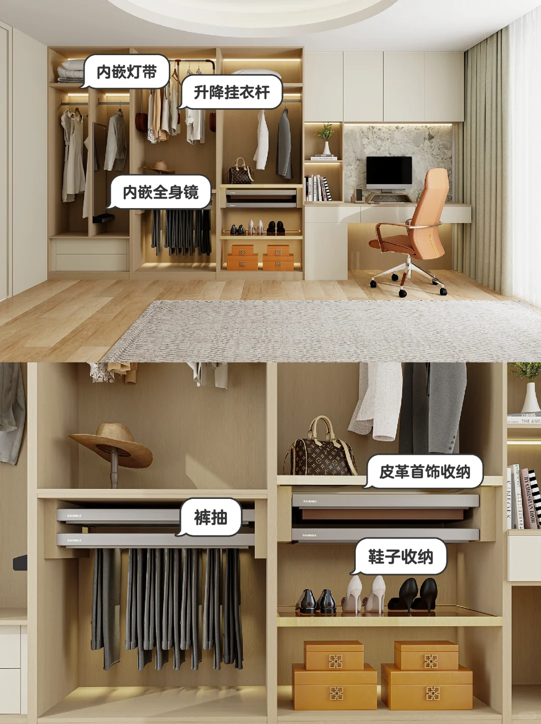 ??書桌柜與衣柜一體化設計,視覺效果更整體流暢,節(jié)省空間的同時也加大了儲物空間。