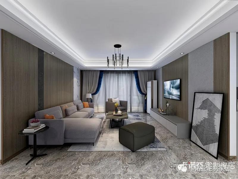 卡諾亞木光之城搭配黑金剛、漢白玉及灰姑娘組成的護(hù)墻板,在客廳里占據(jù)極其顯眼的位置,改變白墻的單一視覺。灰色一字型電視矮柜,與墻面遙相呼應(yīng)。