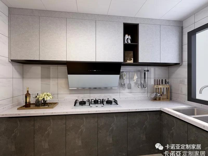 廚柜色彩采用撞色設(shè)計(jì),吊柜采用淺灰的灰姑娘,地柜則是深灰的黑金剛,上淺下深,避免頭重腳輕,整體視覺簡(jiǎn)約大氣。