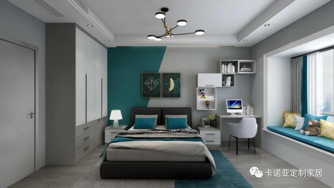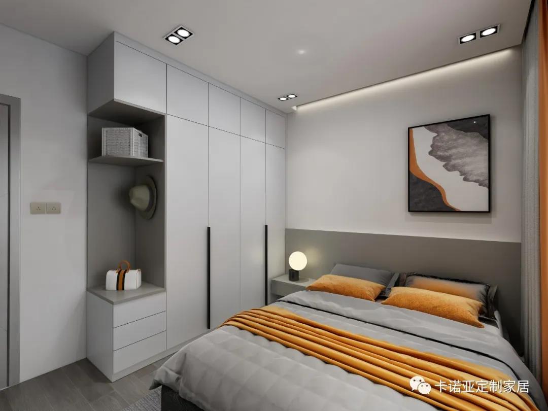 點(diǎn)綴橘黃色床品、窗簾及掛畫