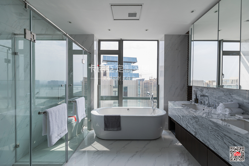 深色浴室柜體點(diǎn)睛,加上大面積玻璃的使用,衛(wèi)生間大氣明亮,空間通透開闊。