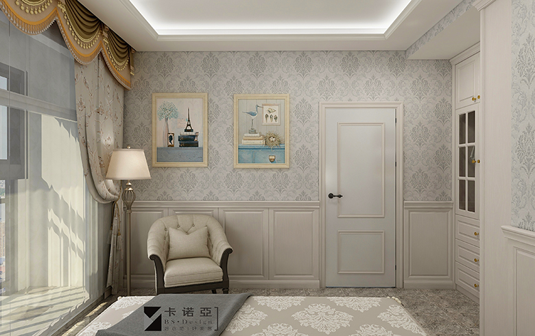 高原雪橡天然素凈的白,營造出極為潔凈素雅的家居環(huán)境,墻裙式護(hù)墻設(shè)計與歐式紋飾的壁紙、同色到頂衣柜融為一體,結(jié)合精致的吸塑造型,營造浪漫簡歐風(fēng)。