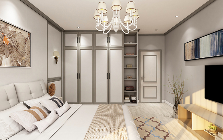 簡歐風(fēng)格特有的方正造型灰色邊框的木門,一改木門平面單一的視覺印象,同時與到頂衣柜、護(hù)墻板在紋理及材質(zhì)上相呼應(yīng),整體空間寧靜素雅,溫暖直抵人心。