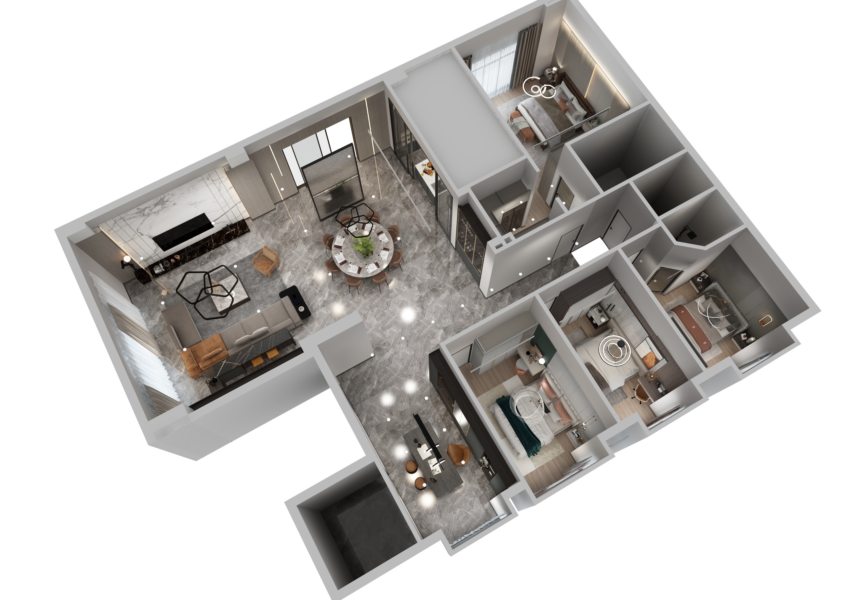 在接近夜幕時(shí)刻的傍晚,天空還帶著微微的晚霞,天空是霧蒙蒙的,泛著暖暖的光,暮色刻畫出來的棱角,不像深夜那么模糊,不像白天那么清晰,有一份恰好的柔和感又有一份溫柔的醉意。而我門這次方案的構(gòu)思,將設(shè)計(jì)方案定義為極簡(jiǎn)風(fēng)格,保留著黑白灰本有的色塊分明度,在色彩元素上增加了一些暖色調(diào),在材質(zhì)提現(xiàn)上摻入一些絲絨磨砂柔軟觸感的質(zhì)感搭配,緩和黑白灰的線條感,讓冷峻的空間感多一點(diǎn)生活的煙火氣息