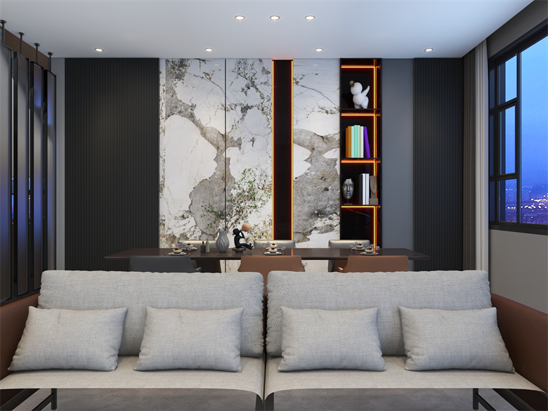 此案,為現(xiàn)代極簡(jiǎn)風(fēng)格,整體以簡(jiǎn)單大氣,穩(wěn)重不失溫馨,設(shè)計(jì)上嚴(yán)格遵循人體工程學(xué)原則,在造型、材質(zhì)等方面要符合人的生理和心理需求。此案設(shè)計(jì)的色彩比較單一,顏色多選用單色,或少數(shù)幾種顏色搭配。避免使用多種顏色混搭以及避免使用強(qiáng)烈對(duì)比的顏色,復(fù)雜華麗的顏色,反對(duì)繁瑣的花紋色彩的搭配。在色彩上追求平和、舒緩、內(nèi)斂之感極簡(jiǎn)主義的設(shè)計(jì)多采用直線、方形,或規(guī)則簡(jiǎn)單的幾何形狀,減去一切不必要的元素與細(xì)節(jié),比例精確,整體呈現(xiàn)簡(jiǎn)潔明快,干凈利落感覺。此案中大部分空間運(yùn)用了無(wú)主燈,因?yàn)闊o(wú)主燈設(shè)計(jì)講究的是“見光不見燈,分區(qū)域散點(diǎn)照明”。而且的無(wú)主燈設(shè)計(jì)能夠讓空間更具層次感,顯得非常的高級(jí),若隱若現(xiàn),層次分明。