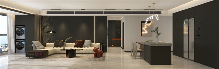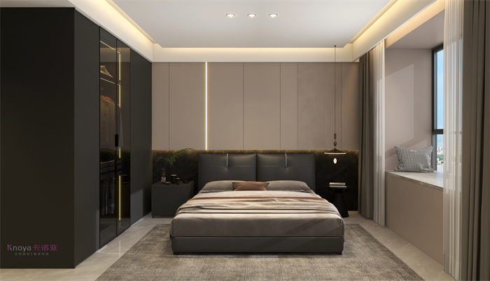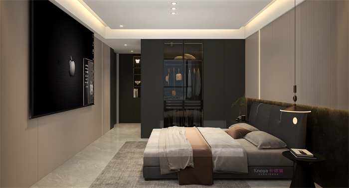 本案業(yè)主更注重與家人們的空間情感交流。戶型墻體的拆改 使布局流線更順暢,更鍥合業(yè)主的需求。玄關(guān)客餐廳采用門墻柜一體化設(shè)計,化繁為簡。鞋柜穿插式設(shè)計既有儲物功能又有美感。啞光巖板嵌入式電視背景+深色系墻板隱形門,延伸整個空間,壁爐和金屬套格更顯高級感,沉穩(wěn)大氣。內(nèi)嵌式酒柜包冰箱管線機,兼具儲物、裝飾、顏值一體。餐桌島臺做了錯位式設(shè)計,即貼合了業(yè)主的日常家居需求,又與整體空間色系相呼應(yīng)。臥室無主燈的設(shè)計還具備多種情景模式,進(jìn)一步提升了臥室的氛圍體驗。