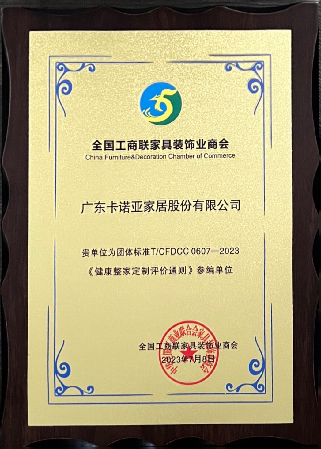 截止目前,卡諾亞成為10大國家及團隊標準參編單位或起草單位,包括團體標準T/CFDCC 0607-2023《健康整家定制評價通則》、GB/T41650-2022《家具 床 穩(wěn)定性、強度和耐久性測試方法》、T/CFDCCO212-2021《家居產品質量評價準則》、T/GCHA1.1-2018《定制家居產品 人造板定制衣柜》、T/CFDCC 0207-2019《定制家居產品安裝服務規(guī)范》等;作為無醛添加板材使用先行者,卡諾亞先后通過中國環(huán)境標志認證、美國EPA-NAF無醛豁免認證、美國CARB-NAF無醛豁免認證、日本F★★★★環(huán)保認證、瑞士SGS環(huán)保認證等權威榮譽,致力為廣大消費者打造一個環(huán)保、健康、綠色的家居生活空間。