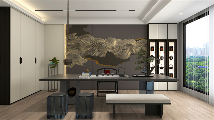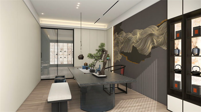 茶室:打破傳統(tǒng)對(duì)稱均衡,一側(cè)一門到頂封閉柜,一側(cè)半開放式設(shè)計(jì),既彰顯東方韻味,又為視覺做減法,簡(jiǎn)單大雅。玻璃的通透與木紋的肌理相互交融,剛?cè)嵯酀?jì),精致而高級(jí)。