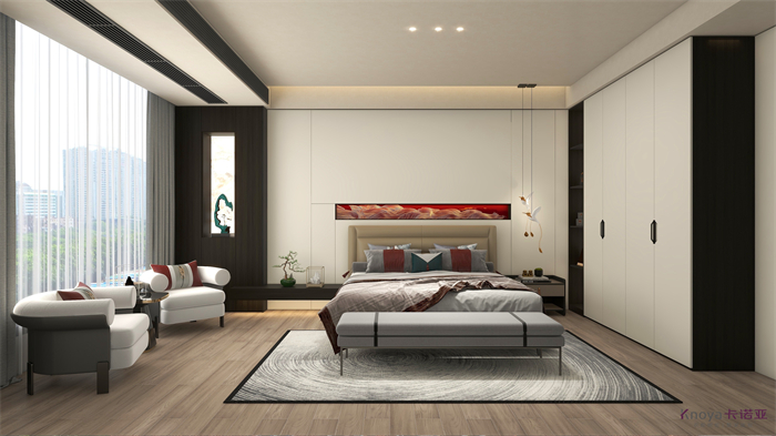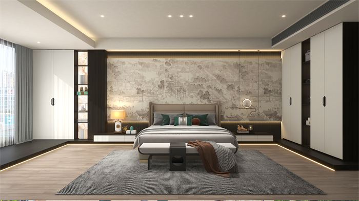 主臥:衣柜及床頭柜采用對(duì)稱式設(shè)計(jì),與圓形燈裝飾掛件形成了方與圓的空間禮序,多處鏤空設(shè)計(jì)展示朦朧透視的詩意想象。床尾凳實(shí)用與顏值兼?zhèn)?,要穿的衣服可以放在這里,還可充當(dāng)早餐椅,就著陽光,吃著早餐。深色U型地臺(tái)將淺色柜體抬起,收納與顏值兼?zhèn)洌?D錯(cuò)落增加懸浮感,搭配古風(fēng)市井畫,夢(mèng)回千年古都。