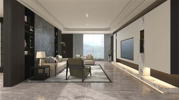 沙發(fā)背景啞黑鋁板柜對(duì)稱設(shè)計(jì),與深色“沉香”完美契合,遇見東方禮序之美,木紋、石紋、鋁板,傳統(tǒng)與現(xiàn)代材質(zhì)碰撞彰顯層次感,搭配國風(fēng)家品,更顯東方意境。