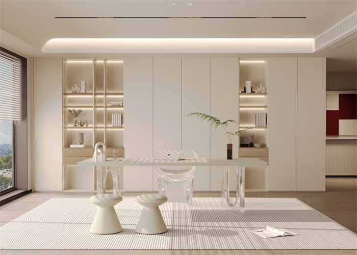 4、書(shū)房:整個(gè)房間用調(diào)和后的暖白色打底,整墻書(shū)柜既有開(kāi)放格及玻璃門(mén),更有封閉柜,展示、收藏兼?zhèn)?。透明材質(zhì)的桌腳與座椅,讓空間通透敞亮、淺淡平和,是妥妥的“C位擔(dān)當(dāng)”。一株綠植,給溫潤(rùn)通透的空間帶來(lái)活力。百葉窗遮光,顏值和實(shí)用兼顧。