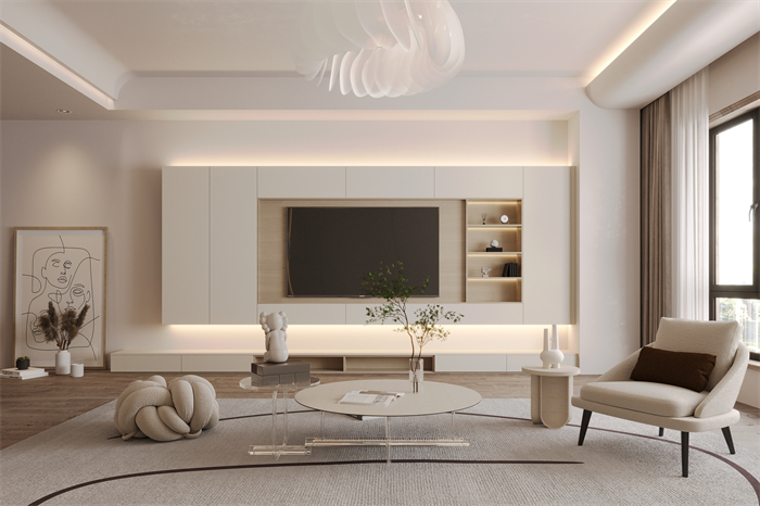 1、客廳:一眼望去,一股朦朧的奶白感拂面而來(lái),頓時(shí)讓人卸下疲憊,心生平靜?;刈中坞娨暪?,打造整墻收納,底部懸空設(shè)計(jì)加燈帶,輕盈時(shí)尚、自在舒適,營(yíng)造暖和的氛圍感。