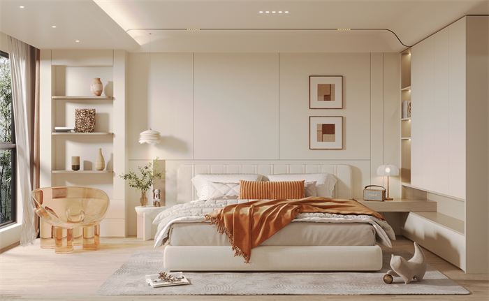 5、臥室:以奶油風(fēng)白色調(diào)為主,床品、掛畫(huà)、座椅等跳躍色點(diǎn)綴,淡雅溫柔,仿佛為臥室加了一層柔光濾鏡。衣柜底部延伸出懸空床頭柜,一體設(shè)計(jì)更整體更省空間,一改傳統(tǒng)床頭柜的對(duì)稱(chēng)設(shè)計(jì)。大落地窗設(shè)計(jì),光線(xiàn)好的床頭一側(cè)定制辦公區(qū)和書(shū)柜,舒適兼多功能。