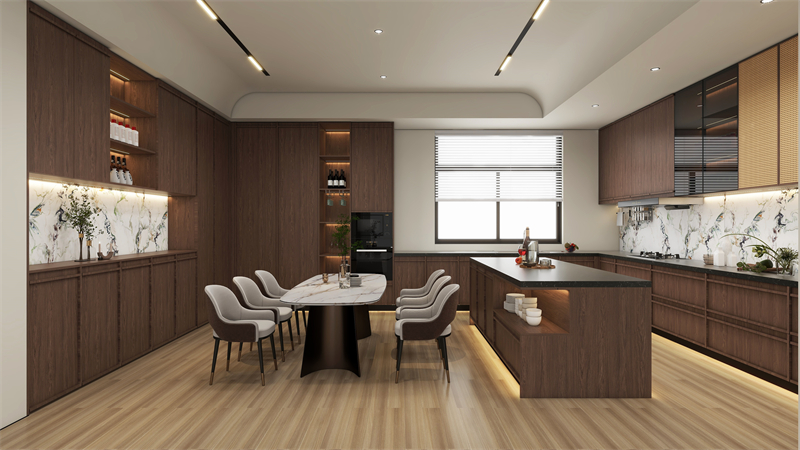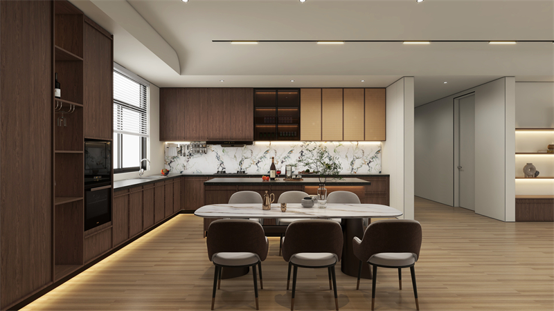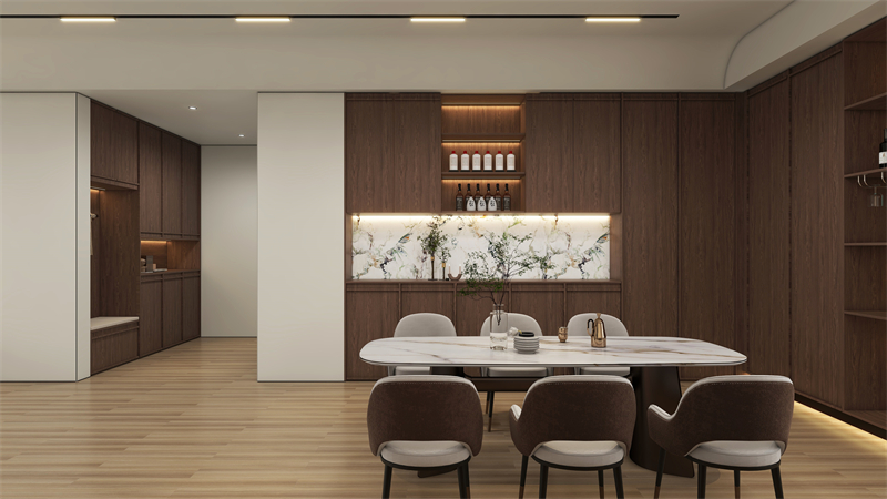 餐邊柜和櫥柜一體化設(shè)計(jì),石紋背板嵌入,更顯高級(jí)感,同色同奢定制,弱化了餐廳與廚房過渡的生硬感。