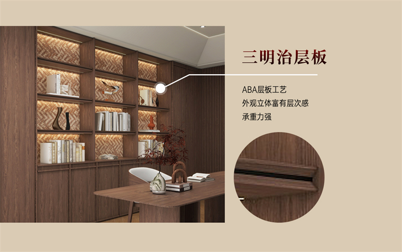 書柜采用三明治層板,外觀立體,富有視覺層次感且承重力強(qiáng)。木紋擁有歲月和自然的痕跡,為空間增添懷舊感,讓書房散發(fā)獨(dú)特的氣質(zhì)。