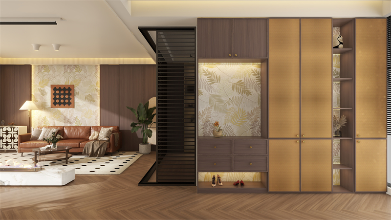 微醺濾鏡下的中古風(fēng),從入戶起就開始鋪墊復(fù)古的基調(diào)。胡桃木紋理搭配咖啡色藤編,讓古樸的氣息從玄關(guān)開始,彌漫家中每個(gè)角落,以復(fù)古高級的腔調(diào)為畫筆,勾勒出自帶電影氛圍感的空間,打造富有享受的視覺空間。