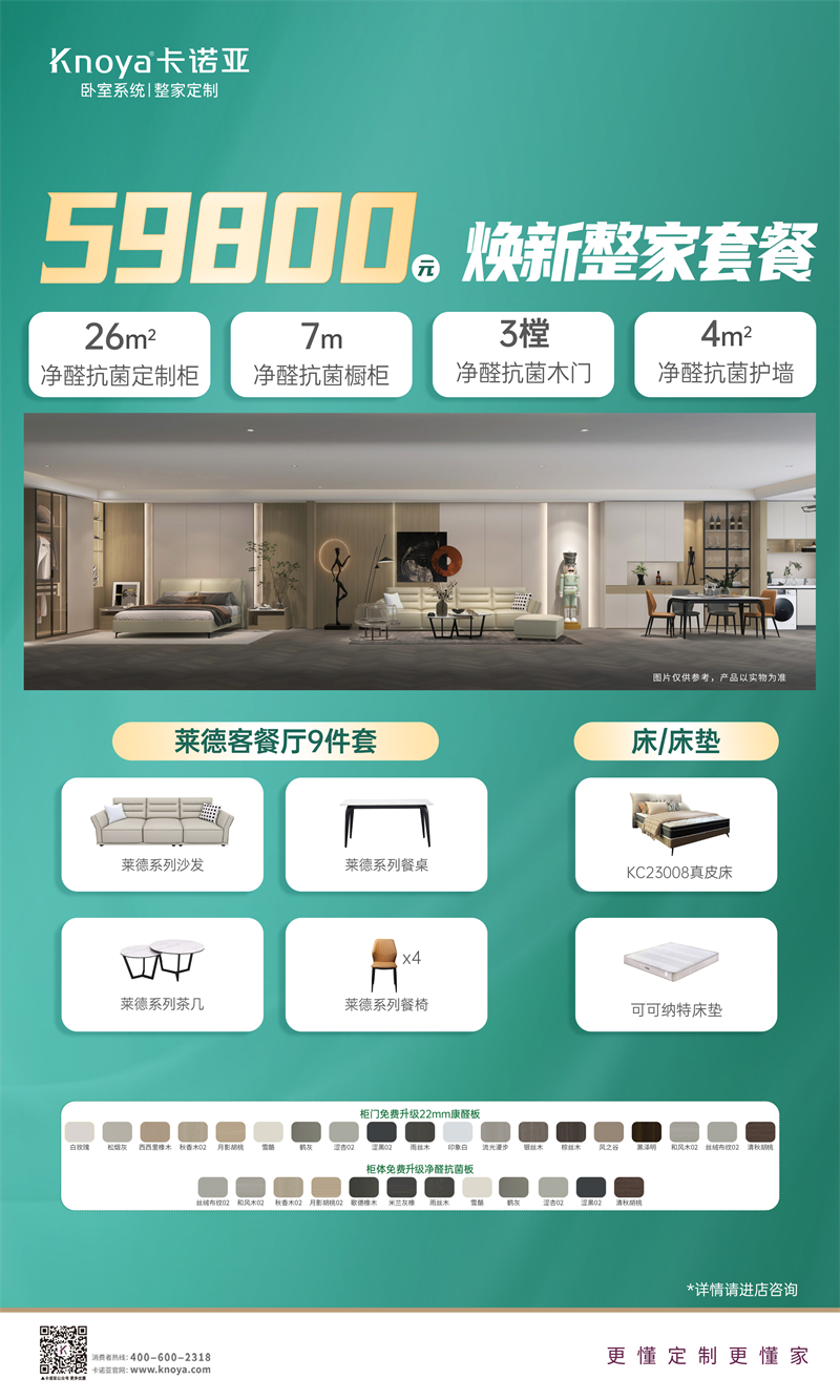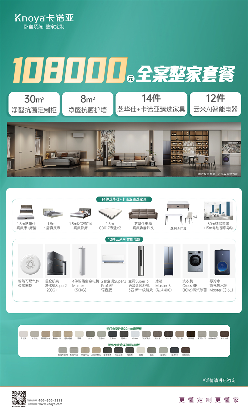 卡諾亞此次315活動,攜手多個高端品牌如芝華仕、CBD、云米科技等,為消費(fèi)者提供一站式的家居解決方案?;顒悠陂g,卡諾亞除了以上2大套餐,還精心推出32800元忙在臥室套餐、28800元享在臥室套餐、24800元學(xué)在臥室套餐等,涵蓋臥室系統(tǒng)+整家定制兩大品類,包括定制柜、護(hù)墻板、全屋家具以及智能家電,聯(lián)手更多大牌,真正實現(xiàn)“整家定制更高配,全屋家具更滿配,智能家電更全配”的理念。