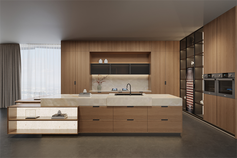 產(chǎn)品亮點(diǎn):1.形:K冕拉手門型將冠冕與K字原創(chuàng)設(shè)計(jì)相結(jié)合,巧妙傳遞品牌的尊榮之意。2.質(zhì):甄選天然木皮,其天然紋理與自然色彩,賦予空間沉穩(wěn)深邃之感。3.氣:鑲嵌、圓弧、3D數(shù)碼打印等傳統(tǒng)工藝與現(xiàn)代技術(shù)結(jié)合,現(xiàn)代中式美家呼之欲出。4.韻:冰裂紋發(fā)光板的運(yùn)用,宛如冰凌閃耀,映照星光,為空間增添夢幻般的詩意氛圍。5.神:中島臺(tái)升降置物架、高端智能衣物護(hù)理機(jī)等智能配置,為生活帶來便捷與品質(zhì)。