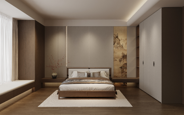 主臥以簡(jiǎn)約的線條與溫潤(rùn)的木質(zhì)構(gòu)筑出寧?kù)o致遠(yuǎn)的休憩氛圍。護(hù)墻設(shè)計(jì)與整體空間一氣呵成,通過(guò)材質(zhì)的層疊與光影的漫射,勾勒出靜謐安和的寢居意境??臻g布局疏朗有致,摒棄繁復(fù)裝飾,以留白之境呼應(yīng)宋式美學(xué)。此處不為展示,只為安頓身心,讓每一夜安眠都似沉浸于墨香文韻之中,盡顯東方美學(xué)的含蓄與深遠(yuǎn)。