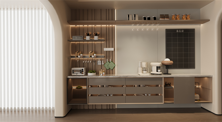 布局設(shè)計(jì)上,羅亞全屋定制更是打破了家居就該有固定模樣的陳規(guī)。餐廳與陽臺(tái)不再是割裂的存在,而是被打造成聯(lián)動(dòng)的“咖啡區(qū) + 品酒區(qū)”;早晨在這里沖一杯手沖,用咖啡香喚醒元?dú)?;夜晚調(diào)一杯利口酒,讓微醺消解疲憊。