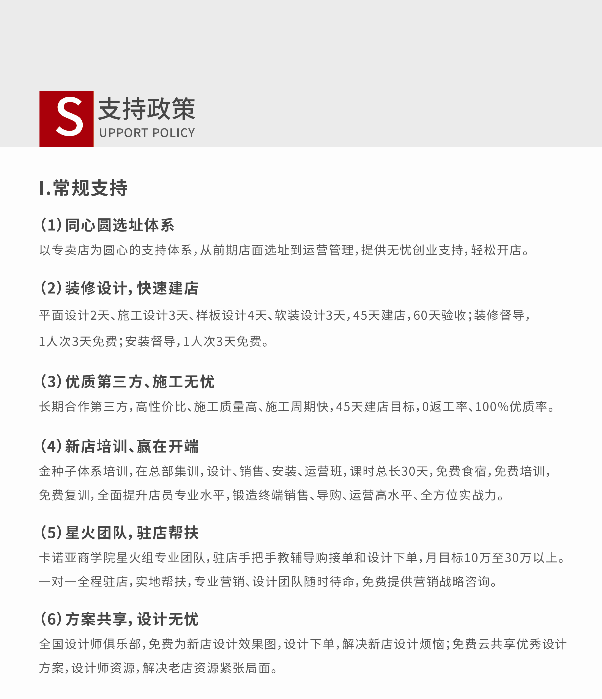 以上就是關(guān)于加盟全屋定制扶持方面的介紹了,當然每個品牌的扶持政策都是不一樣的,具體還是要以實際情況為準。加盟全屋定制選擇卡諾亞定制家居品牌,可免加盟費,送裝修,返樣板,并提供了全面的扶持政策,加盟開店全程都有專業(yè)人員為你服務(wù),專業(yè)優(yōu)秀的成熟團隊,幫助專賣店快速成長,讓投資者的店面在市場上更具優(yōu)勢,獲利有所保障。 想要了解具體的扶持政策可咨詢在線客服。