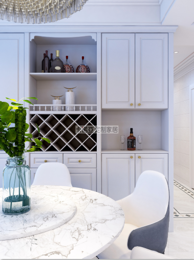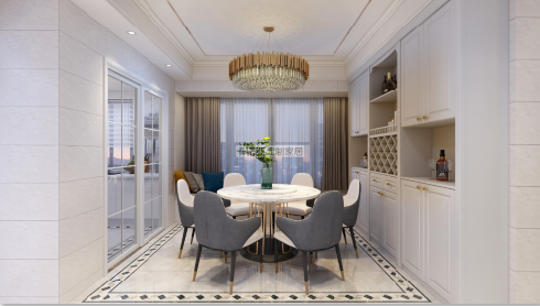 餐廳設(shè)計(jì)比較簡潔,大理石質(zhì)感的餐桌,加上簡約造型的靠背椅,輕奢的金屬桌腳,淺色墻面再配上歐式吸塑造型的柜門,一切都美得剛剛好。餐邊柜到頂設(shè)計(jì),強(qiáng)大的收納功能,讓客廳不再臟亂雜。