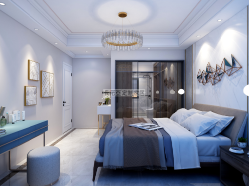 衣帽間設(shè)計(jì)在主臥與主衛(wèi)之間,采用透明玻璃移門隔斷,讓主臥視野更為開闊通暢,防止?jié)駳馇秩胍旅遍g及臥室,同時方便洗漱完畢可直接更衣、睡覺。