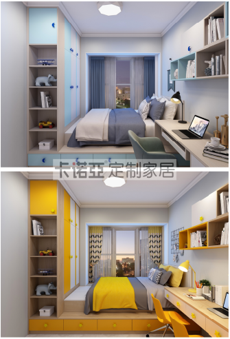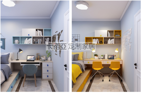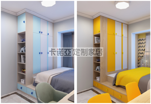 到頂衣柜設(shè)計(jì),滿足孩子日常衣物的收納。男孩房海天藍(lán)+印象白+淺色木紋、女孩房活力橙+印象白+淺色木紋的活力色調(diào)的組合,與房間整體配色相契合。衣柜門側(cè)面的開放格,用來展示玩具、孩子所獲得的獎杯及獎狀,以及記錄成長的相冊。