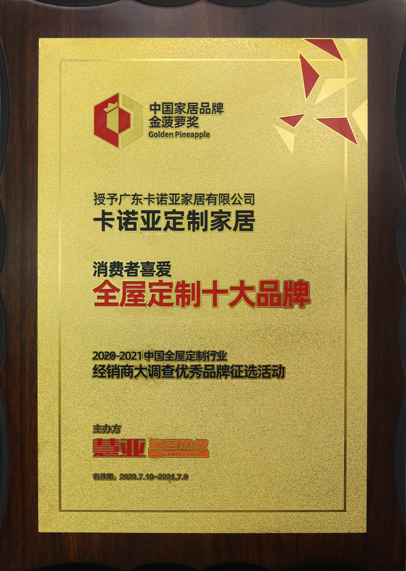 7月10日,2020第五屆中國大定制家居營銷發(fā)展論壇暨家居品牌金菠蘿獎盛典在中國建博會(廣州)舉行。卡諾亞副總經(jīng)理兼營銷總經(jīng)理賴永精,作為發(fā)言嘉賓出席會議,并分享“提升數(shù)字化能力,助力家居業(yè)發(fā)展”主題內(nèi)容。同時,卡諾亞憑借專注定制家居19年的企業(yè)實(shí)力和品牌魅力,榮獲“中國家居品牌金菠蘿獎·消費(fèi)者喜愛全屋定制十大品牌”獎項(xiàng)。