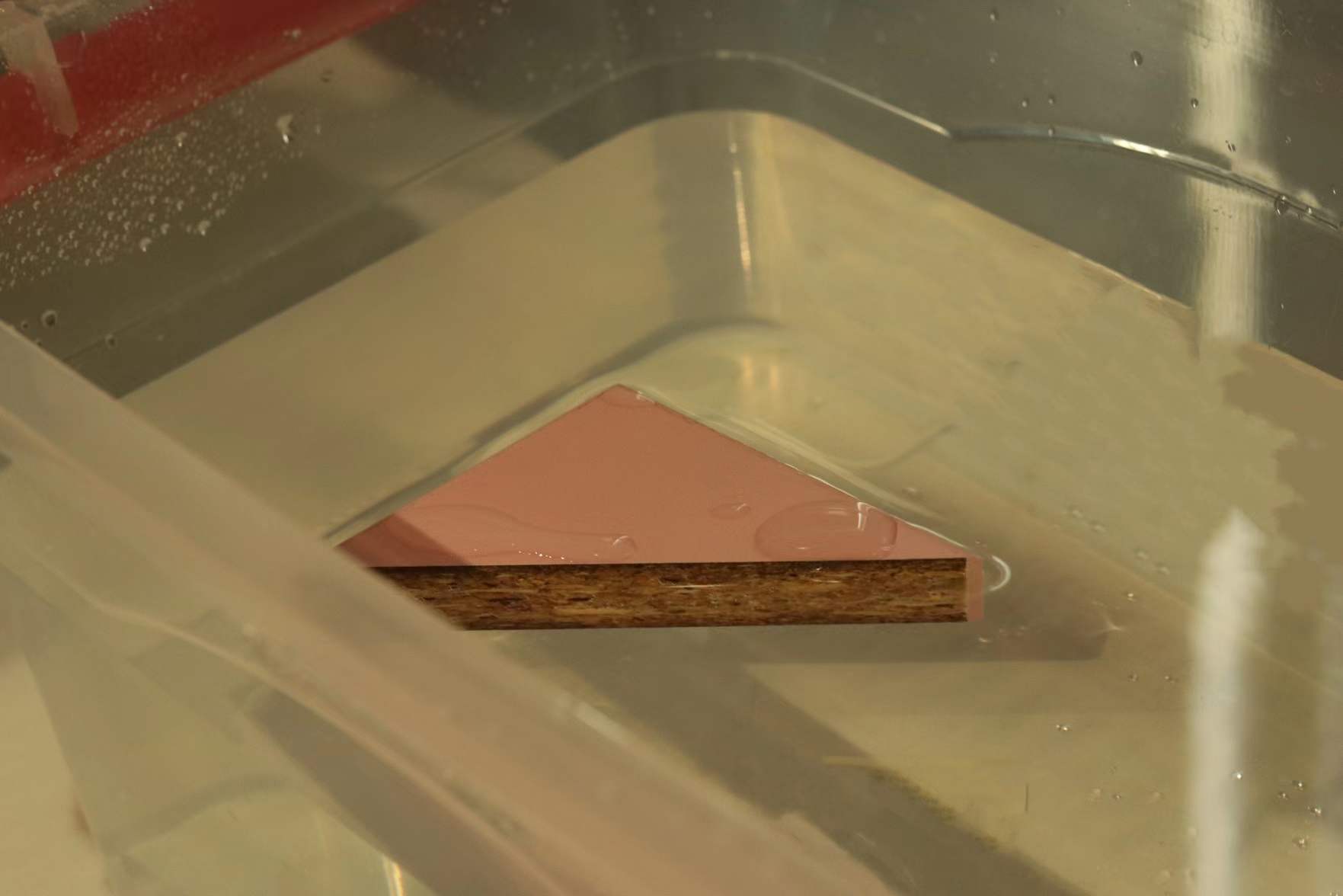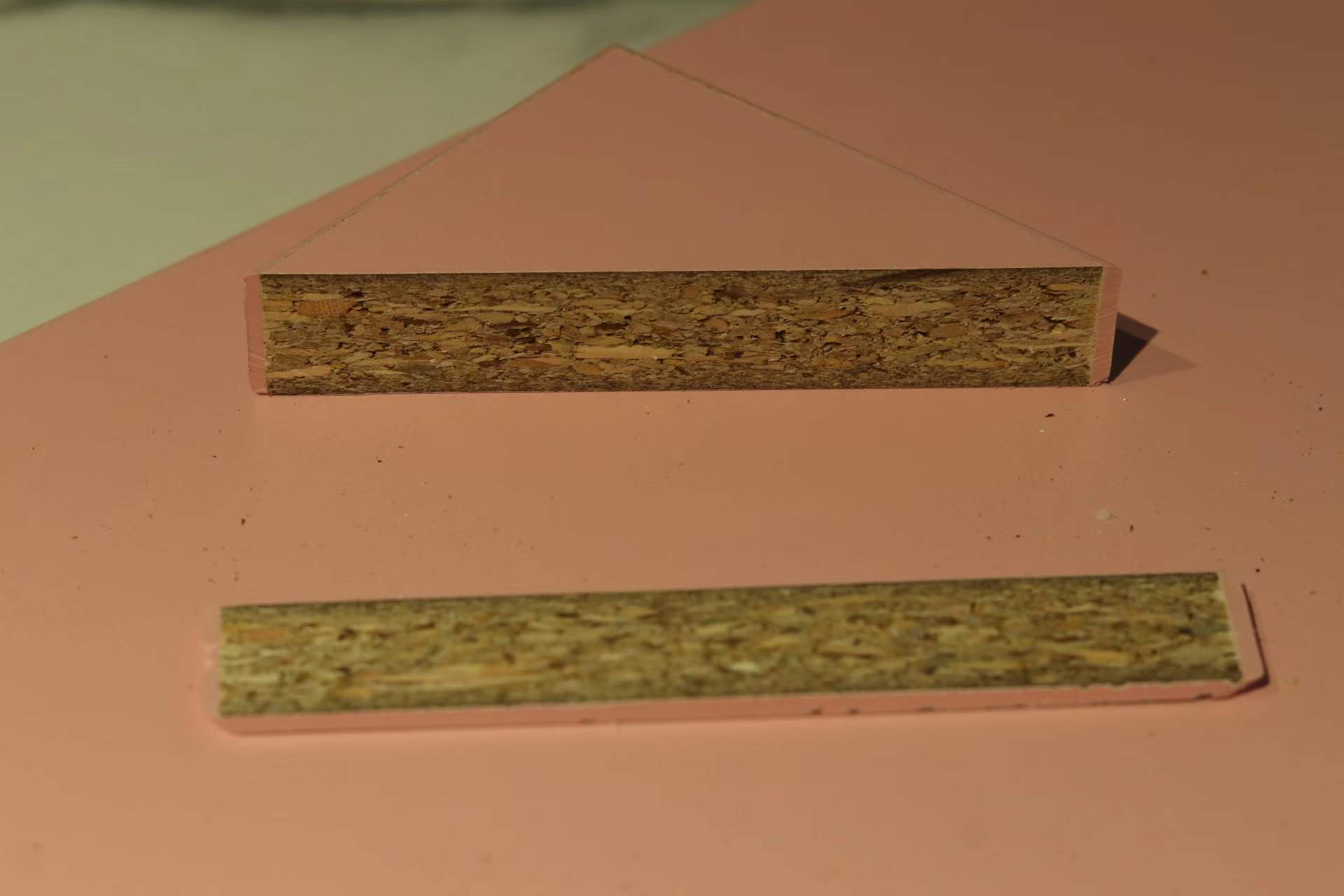 為檢驗(yàn)板材防潮能力,小編將切割后的板材放入水中浸泡,幾個小時之后,將板材撈起發(fā)現(xiàn),看不出板材變形、膨脹,質(zhì)地依舊干燥且輕盈。這是因?yàn)榭等┌迨褂迷灸痉N顆粒,防潮性能強(qiáng),加上聚氨酯粘合劑(MDI膠)是制造密封劑和防水涂料的原料,所以防水防潮能力相當(dāng)出色,更加適用于廚房等潮濕的空間。